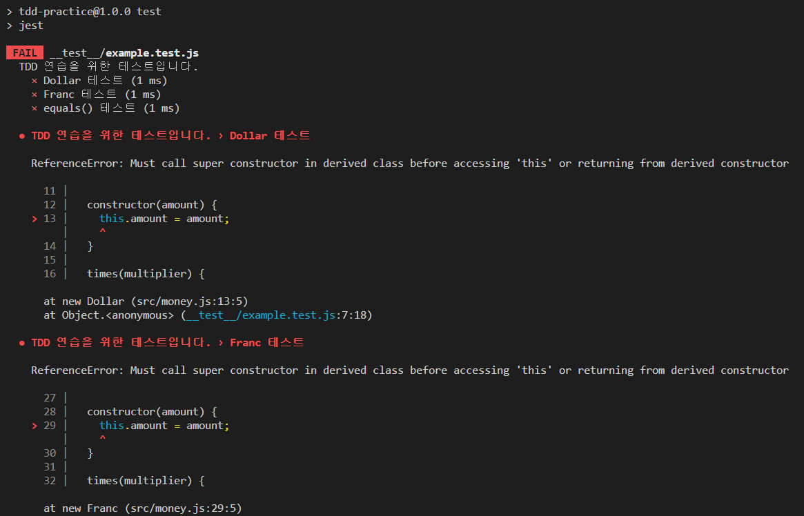 책에서는 빈 클래스를 상속받는다고 해서 테스트가 깨지지는 않았습니다. 그러나 우리의 자바스크립트는 상위 생성자 함수를 호출해주지 않으면 하위 클래스에서 그대로 사용할 수 없습니다.