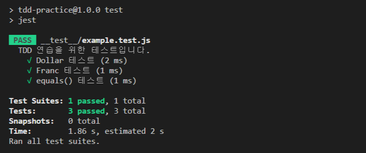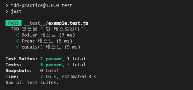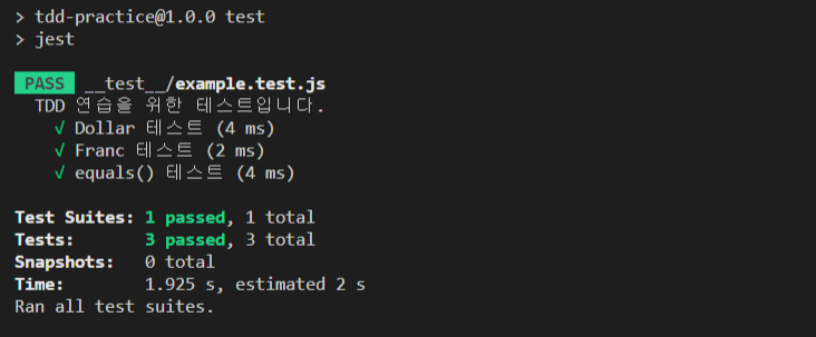 모든 테스트가 성공하는 모습입니다. 이렇게 중복을 제거하여, 상위 클래스로 옮겨주는 작업을 하나 마쳤습니다. 그러나 위쪽의 테스트를 보면, Dollar와 Dollar, Franc과 Franc만을 비교하고 있다는걸 알 수 있습니다. 실제로는 Dollar와 Franc도 비교해보아야 정확한 테스트라고 할 수 있겠죠. 이 부분은 다음 포스트에서 이어서 진행해보겠습니다.
