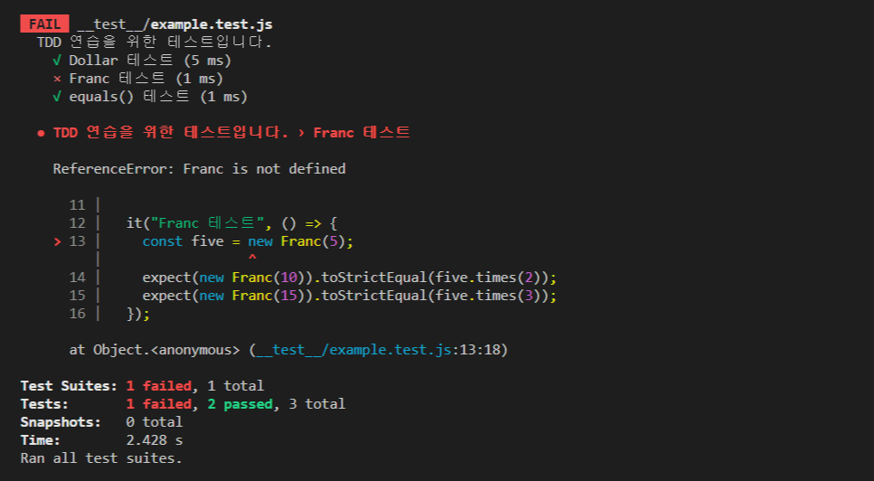 이제 테스트를 돌려보...려고 했는데 equals() 메서드를 테스트할때 Franc은 테스트하고 있지 않다는 것을 깨달았습니다. 빠르게 추가해줍시다.