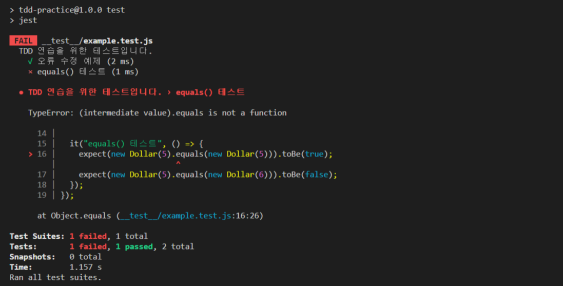 인스턴스의 amount를 꺼내는 대신, 생성한 그대로를 놓고 비교 대상에 times() 메서드를 사용하도록 코드를 변경했습니다. jest에서 객체의 완전 일치 여부를 판단할때는 toBe() 대신 toStrictEqual()을 사용합니다.