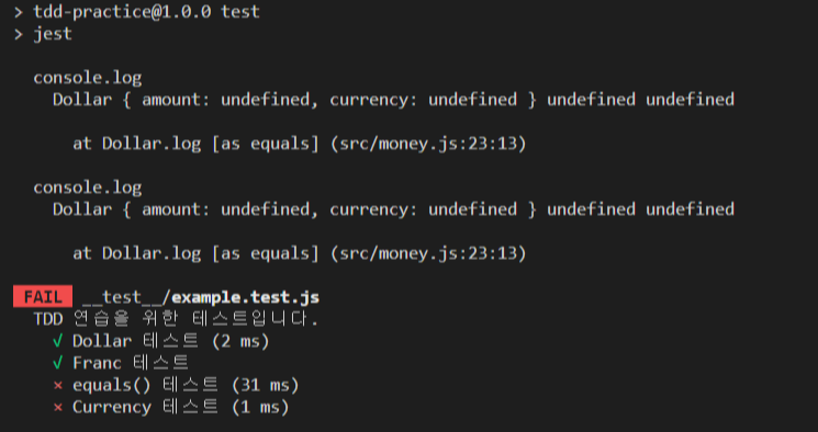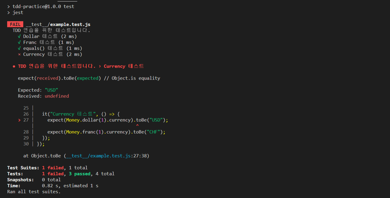 빠르게 테스트를 실패한 후, money.js에서 currency() 메서드를 구현해보겠습니다.