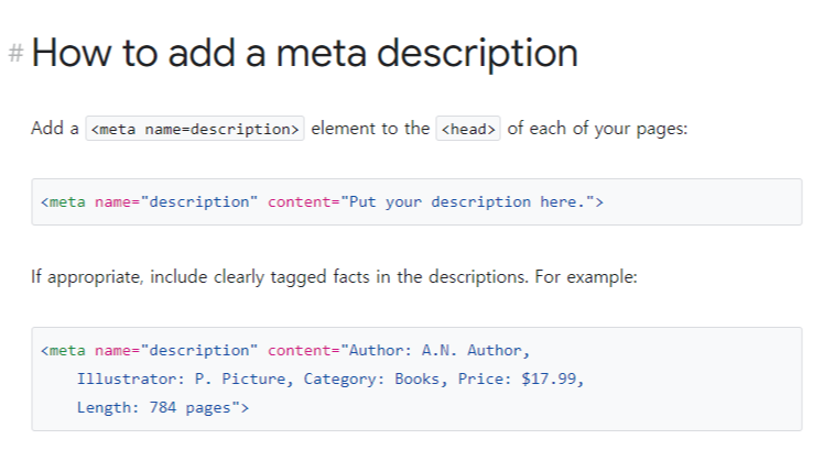 이 중에서 우리가 오늘 알아볼 요소와 가장 가까운 것은 Document does not have a meta description(문서에 메타 설명이 없음) 문서입니다.