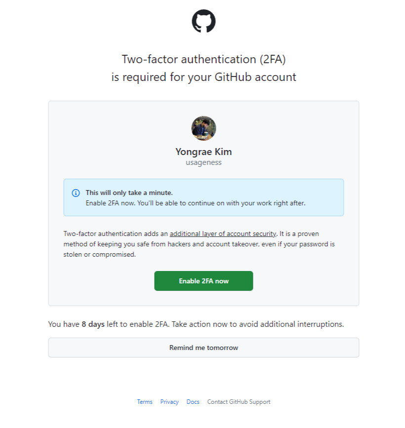 오는 2023년 말부터 Github를 이용하려면 2FA(2단계 인증, Two-Factor Authenication)를 반드시 설정해야합니다. 2FA 자체는 이전에도 지원했던 기능이지만 Github 정책의 변경으로 선택에서 필수가 되어, 해당 기능을 사용하지 않는 유저는 로그인시 일주일간의 적용 유예 기간을 알림을 보게 됩니다. 당장은 건너뛸 수 있지만 일주일 이후에는 Github의 기능을 정상적으로 사용하기 어려워보이니 이참에 적용해보겠습니다.