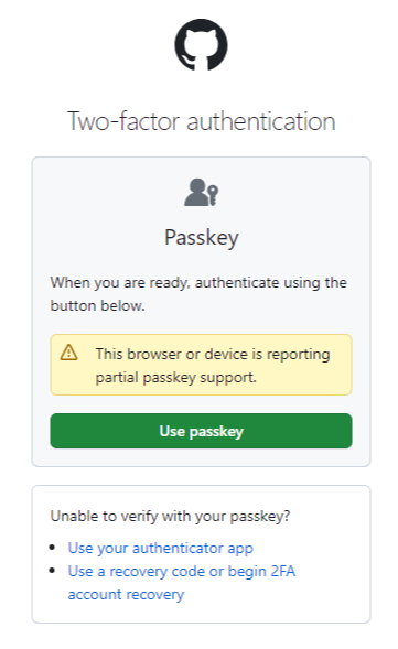패스키 이외에도 물리적 하드웨어 기반의 비밀 키나, Github Mobile을 통해서도 로그인이 가능합니다.