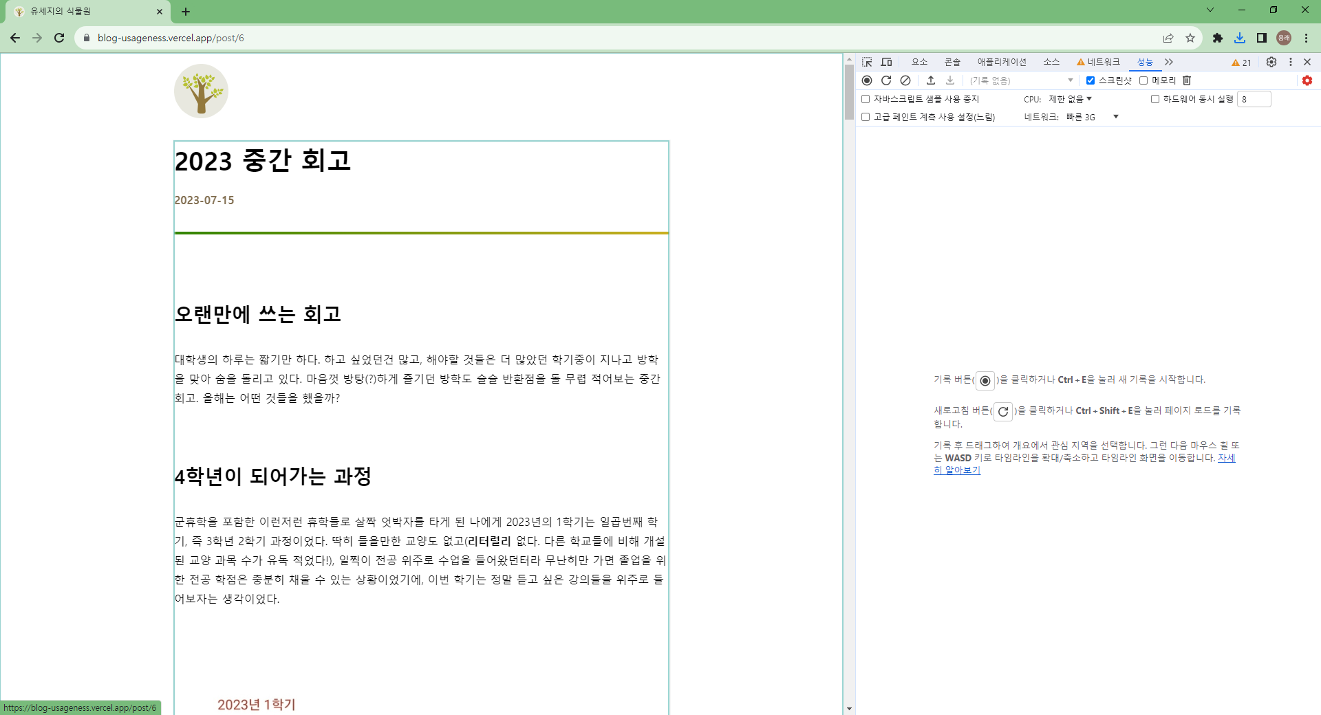 실제로 App Router가 적용된 블로그의 경우, 리액트 프로파일러를 돌려보면 헤더를 제외한 컨텐츠 부분만 리렌더링이 일어나는 것을 확인할 수 있습니다.