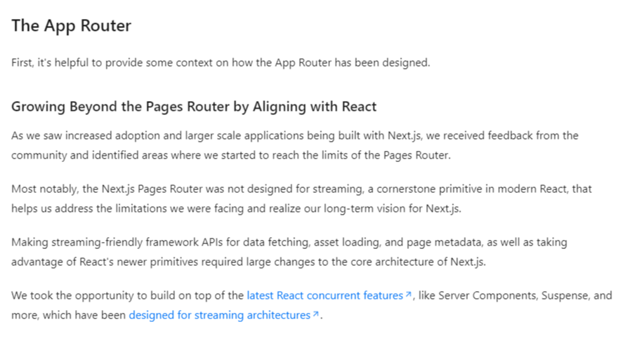 공교롭게도, Next.js에서 13버전을 출시하며 작성한 글에서는 기존의 Page Router가 데이터 페칭과 페이지 메타 데이터를 위한 스트리밍과 같은 최근 React의 발전 방향에 부합하지 않았다고 밝혔습니다. 이는 Next.js가 추구하는 장기적인 비전에도 어긋나는 상황이었기 때문에, 결국 기존 Page Router의 핵심 아키텍쳐에 큰 변화를 주게 되었습니다. 그 결과물이 바로 App Router입니다.