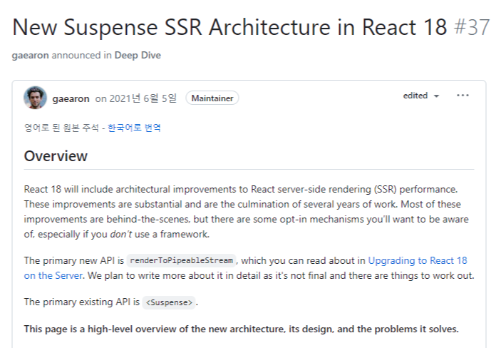왜 React 18이 SSR에 특히나 큰 신경을 썼는지에 대해선 Dan Abramov의 글에 자세히 설명되어 있으니 한 번 참고해보셔도 좋을 것 같습니다.