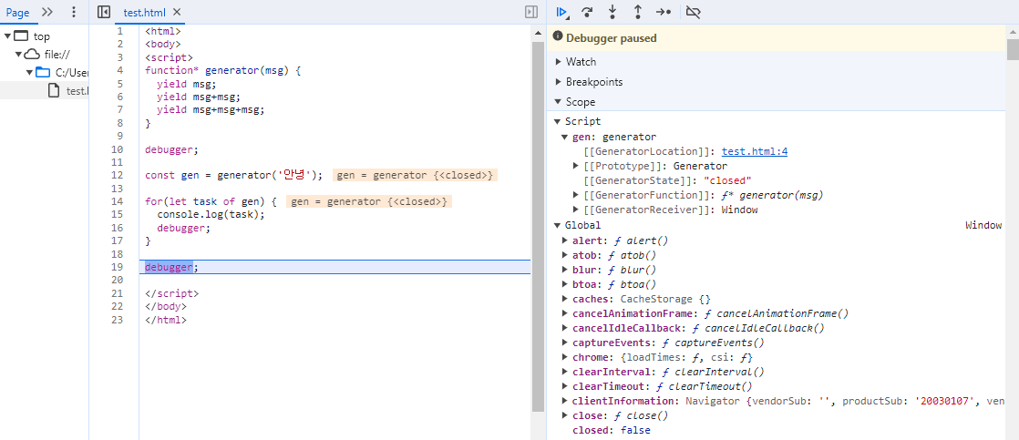 이번에는 for문 외부에서 debugger를 찍어 본 모습입니다.