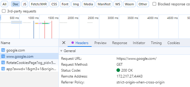 브라우저는 서버에게 HTTP 요청을 통해 google.com에 대한 리소스를 요청합니다.