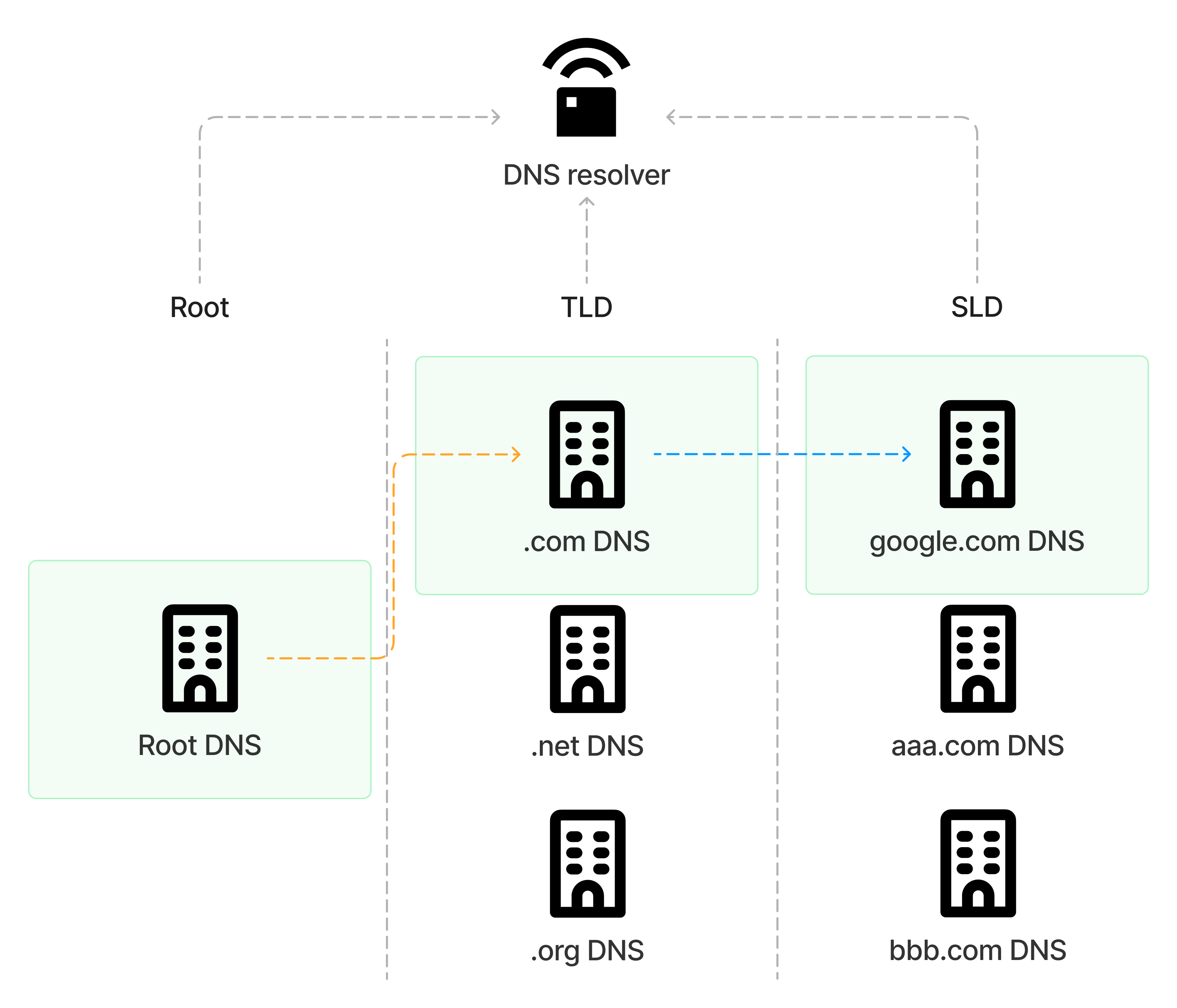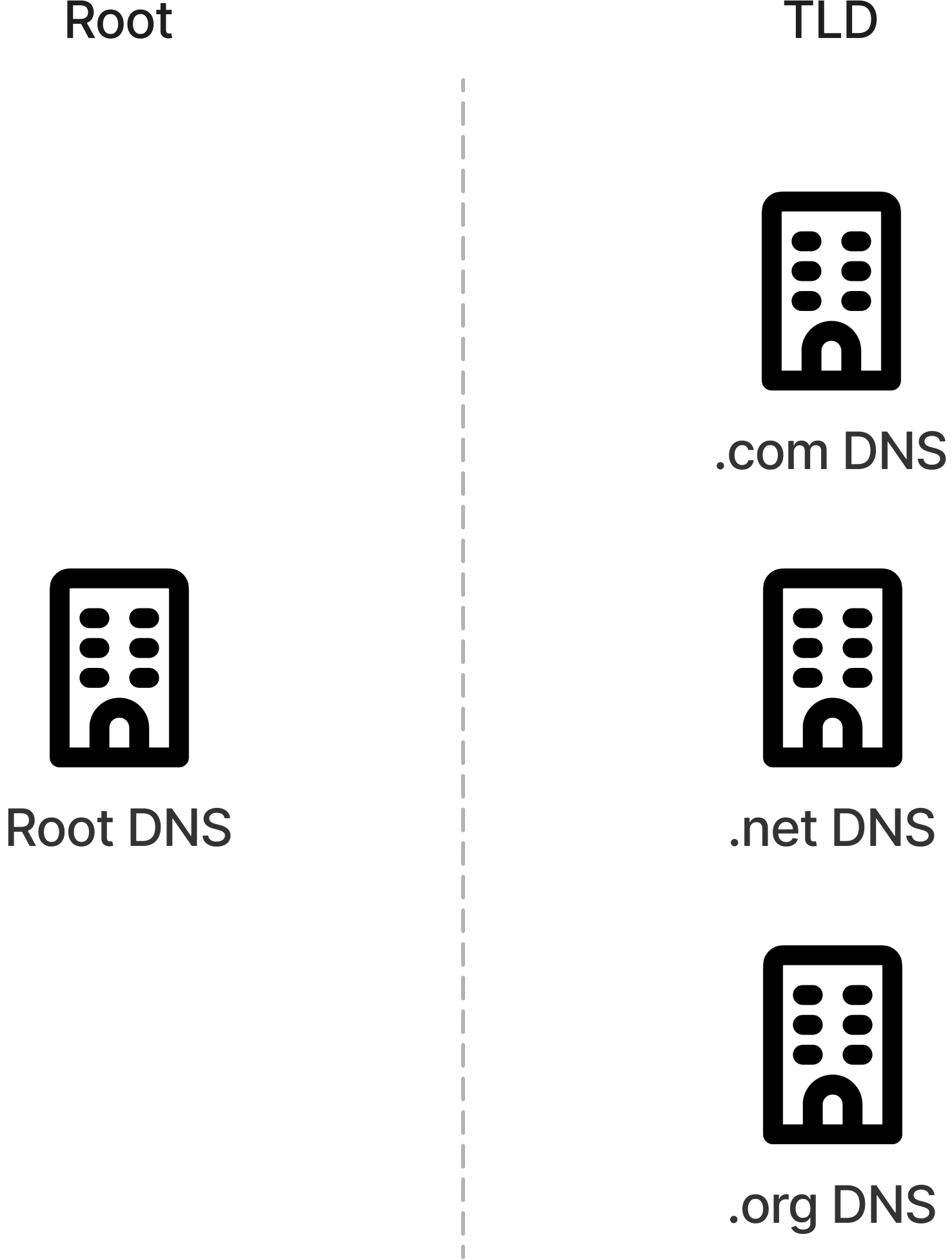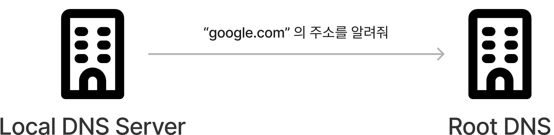 만약 Local DNS에도 해당 도메인에 대한 정보가 없다면, 해당 도메인의 정보를 갖고 있을 것으로 추정되는 Root DNS에게 요청을 보내봅니다. Root DNS는 해당 요청을 받고, 도메인의 구조에 따라 하위의 DNS 서버에게 질의를 시작합니다.
