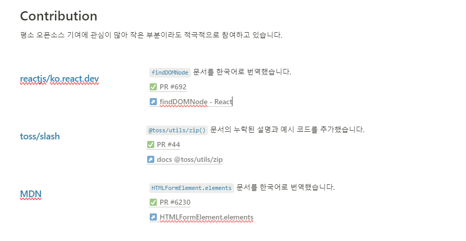 나는 평소에 자주 찾아보는 MDN Docs, 공개 당시 이슈가 되었던 toss의 핫한 라이브러리 slash, 그리고 reactjs의 베타 문서 (현재는 번역이 완료되었다.) 등에 종종 기여를 하였고, 이를 이력서에 기록했다.