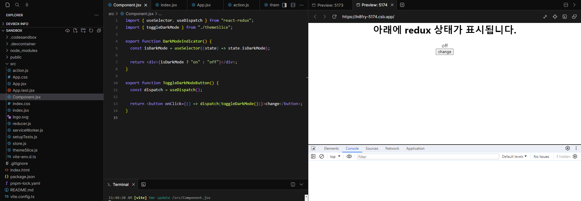 이렇게 createSlice를 이용하여 묶어서 선언하게 되면, themeSlice 내부에 actions와 reducer 등이 자동으로 함께 선언됩니다. 기존과 대비하여 코드 양이 확 줄어든게 느껴지시나요? 이러한 효과 덕분에 많은 사람들이 Redux를 사용할때는 RTK를 함께 사용하고, 공식 문서에서도 이를 권장하고 있습니다.