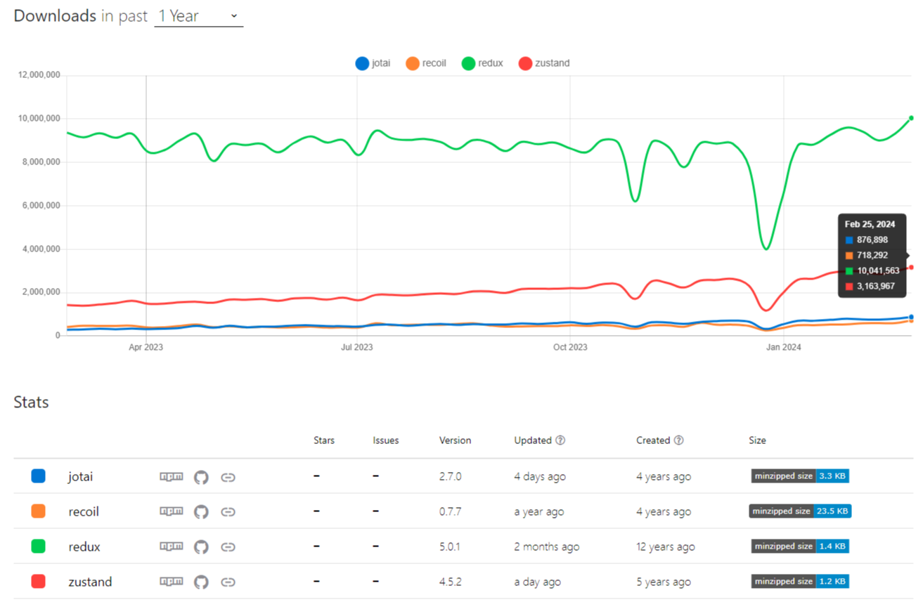 이번 시간에는 오래도록 사용되어 왔던 Redux에 대해 알아보았습니다. Flux 패턴을 충실히 따르는 구조나 편리한 디버깅 툴의 지원 등으로 많은 사용자를 모았었고, 현재는 RTK를 통해 코드의 보일러 플레이트를 줄여 유지보수성을 크게 개선하였습니다. 실제로 다른 라이브러리들과 비교해보면 Redux의 사용률은 상당이 높은 편입니다. (물론, 그만큼 역사도 오래되었네요)