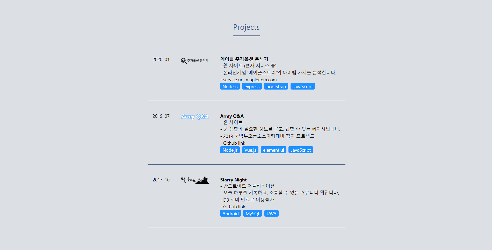 블로그와 별개로 그동안 해온 것들을 간략하게 살펴볼 수 있는 페이지를 만들고 있습니다. 일종의 포트폴리오? 이력서? 뭐라고 표현해야 할지 모르겠습니다만, 부랴부랴 html/css 강좌를 찾아보며