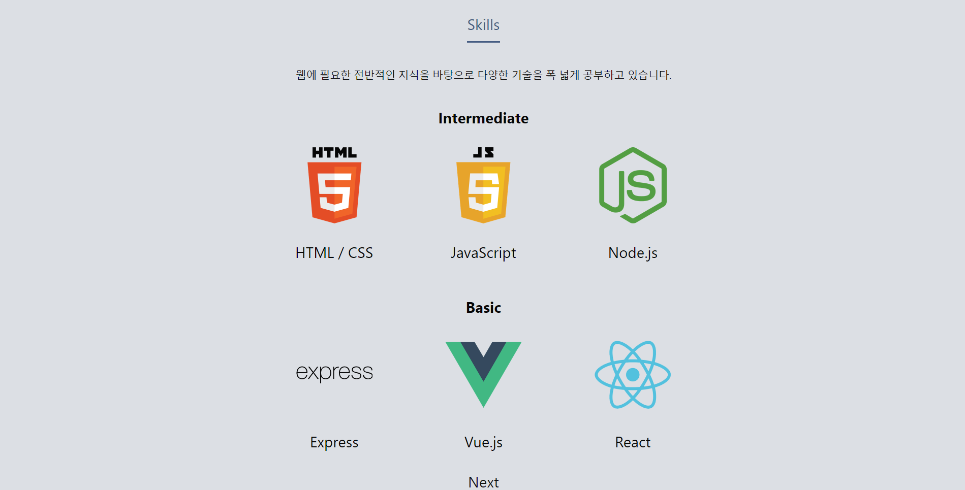 조금 다듬어야 할 필요가 있어보이는 기술 섹션입니다. 그리드라던지, 크기라던지 수정해야 할 곳이 많네요. 그리고 너무 어두운 색으로만 배경을 칠해서 이번 섹션에서는 색상의 변화를 주었습니다.
