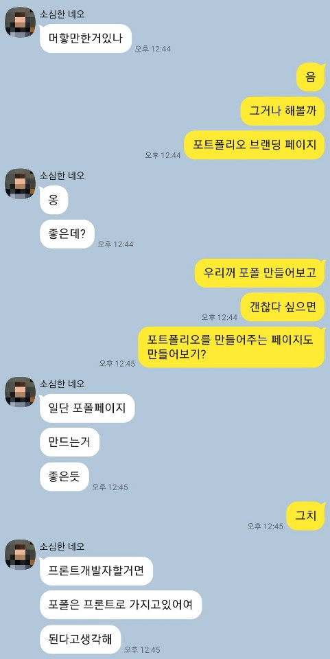 그렇게 포트폴리오를 만드는 프로젝트를 결성하고 (모여서 각자 코딩하는) 이왕 만들어보는거 새로운 프레임워크 공부도 할겸 리액트를 써보는게 어떻냐는 선배의 제안에 살짝 망설여졌지만, 모르는 부분은 친절히 알려주기로 합의를 보고 사용하기로 결정하였습니다.