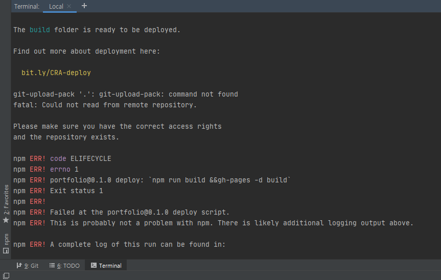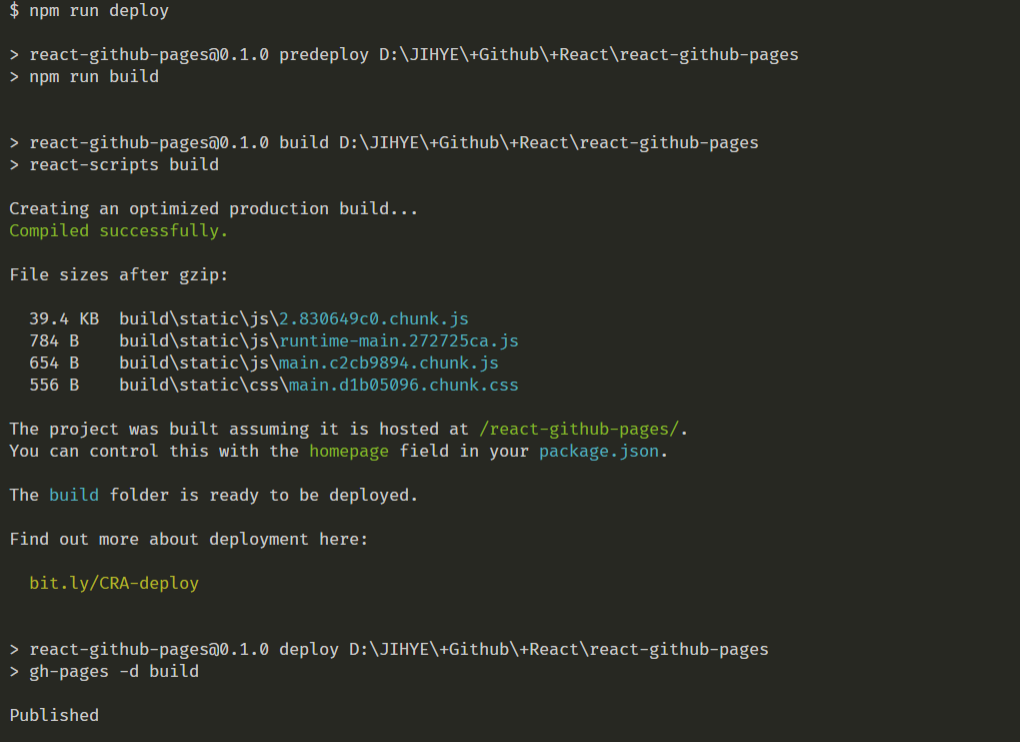 내가 오류가 났던 과정 다음엔 `gh-pages -d build` 명령어가 실행되는구나...
