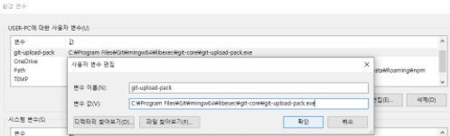 이걸 어떻게 해야할지 하염없이 구글만 붙잡고 늘어지던 차에 환경변수라는 키워드를 보게되었다. 시스템에서 git-upload-pack 이라는 구문을 저 경로로 인식시켜 줄 수만 있다면 해결되지 않을까? 라는 가설을 세우고 환경 변수 세팅을 해보았다.