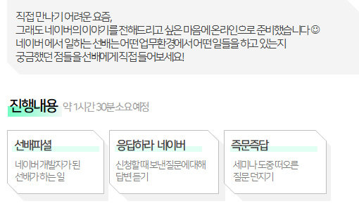 오픈클래스를 통해 이미 다양한 채용 정보등을 공유하고 있던 네이버에서 현재 재직중인 개발자들의 후배들을 초대해 생생한 경험을 나눈다는 취지의 행사인데요, 이번에 네이버에 취업하신 선배님에게 이 소식을 듣고 바로 지원했습니다.