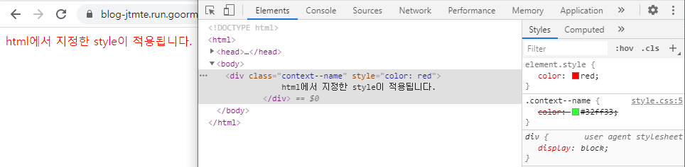 element.style로 표시되며 html상의 style이 우선적으로 적용되었습니다.