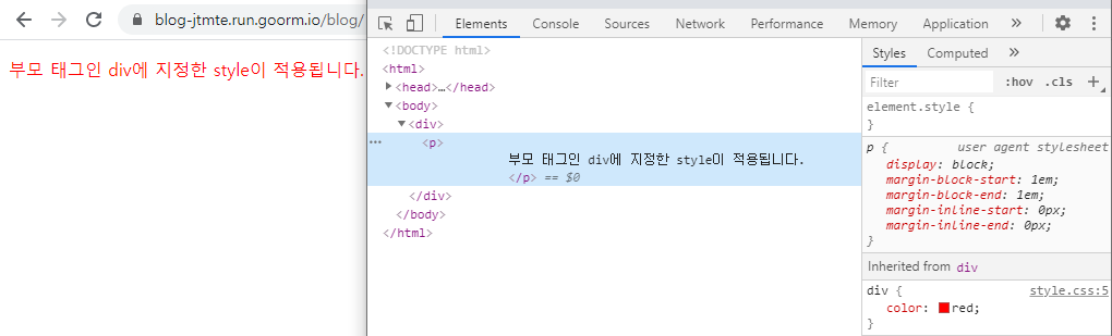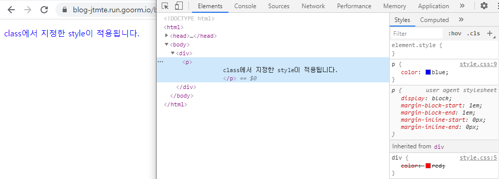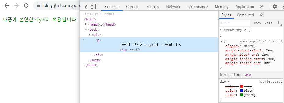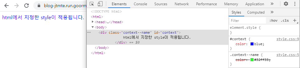 방금전에 사용했던 스타일에서 !important를 제거한뒤, 확인해보겠습니다.