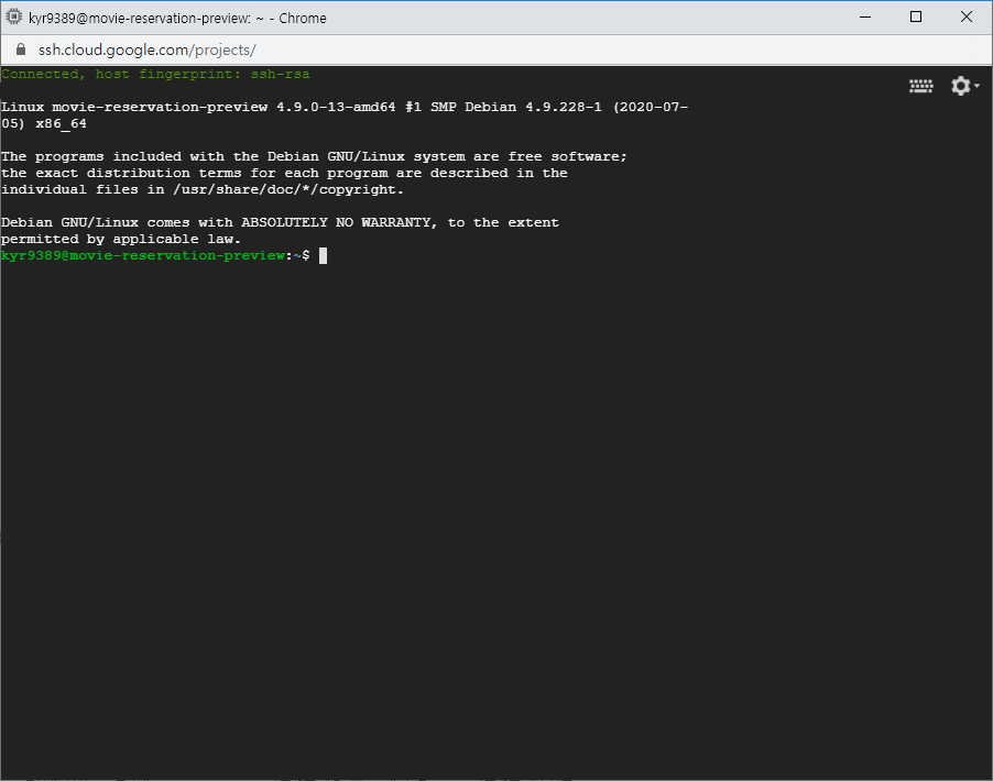 새창이 열리면서 콘솔창이 실행되었지만 SSH 인증에 약간 시간이 걸렸습니다. OS에서 직접 인증하는 방법을 사용하면 단축된다는 안내문이 있었는데 아직 해보진 못했습니다.