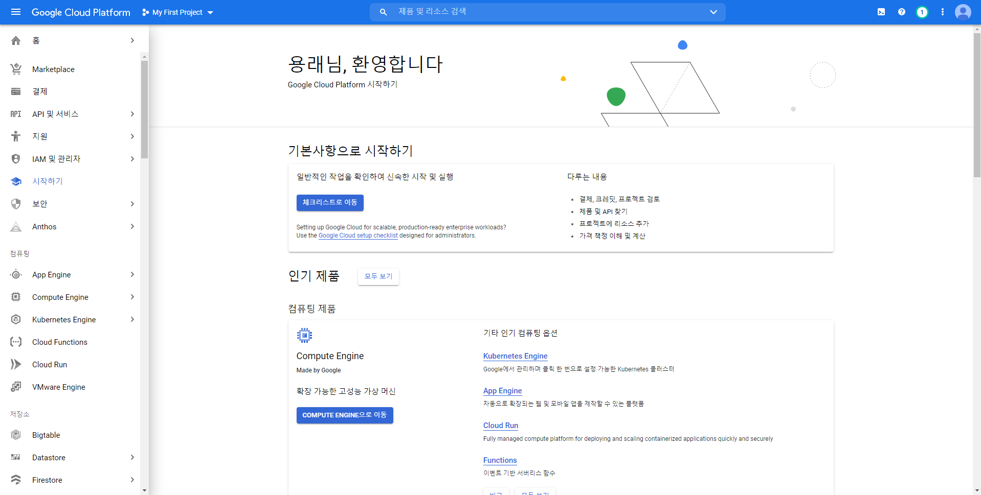 가장 먼저 구글 클라우드 플랫폼에 가입하여 무료 크레딧을 받았습니다.