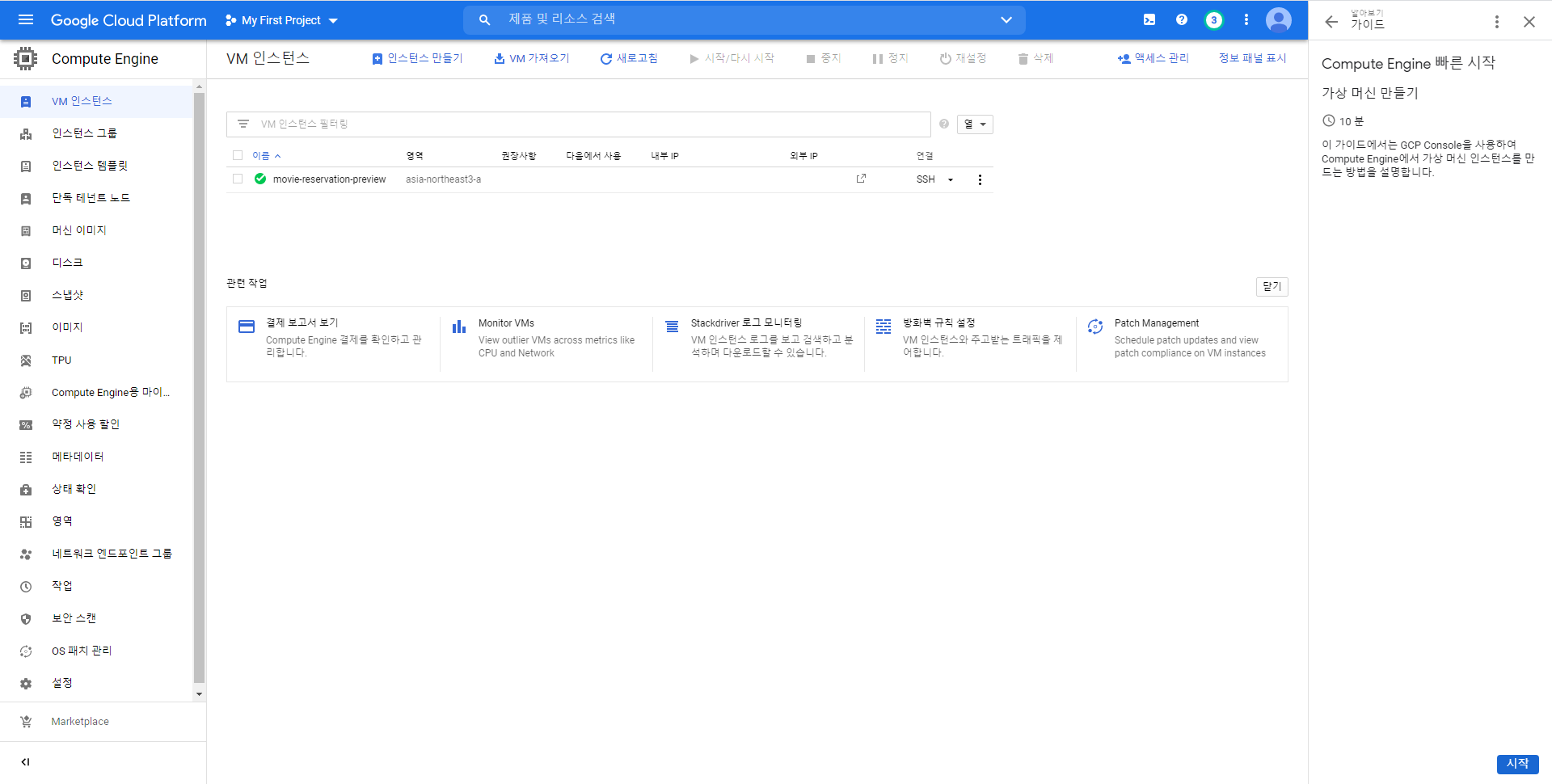 처음보는 이름의 메뉴도 많고 다양한 작업을 할 수 있을 것 같이 보이지만... 오늘 제 목적은 서버를 올려 웹 페이지를 띄워주는것이기 때문에 새 VM(가상머신) 인스턴스 만들기를 클릭하여 새 공간을 구성합니다.