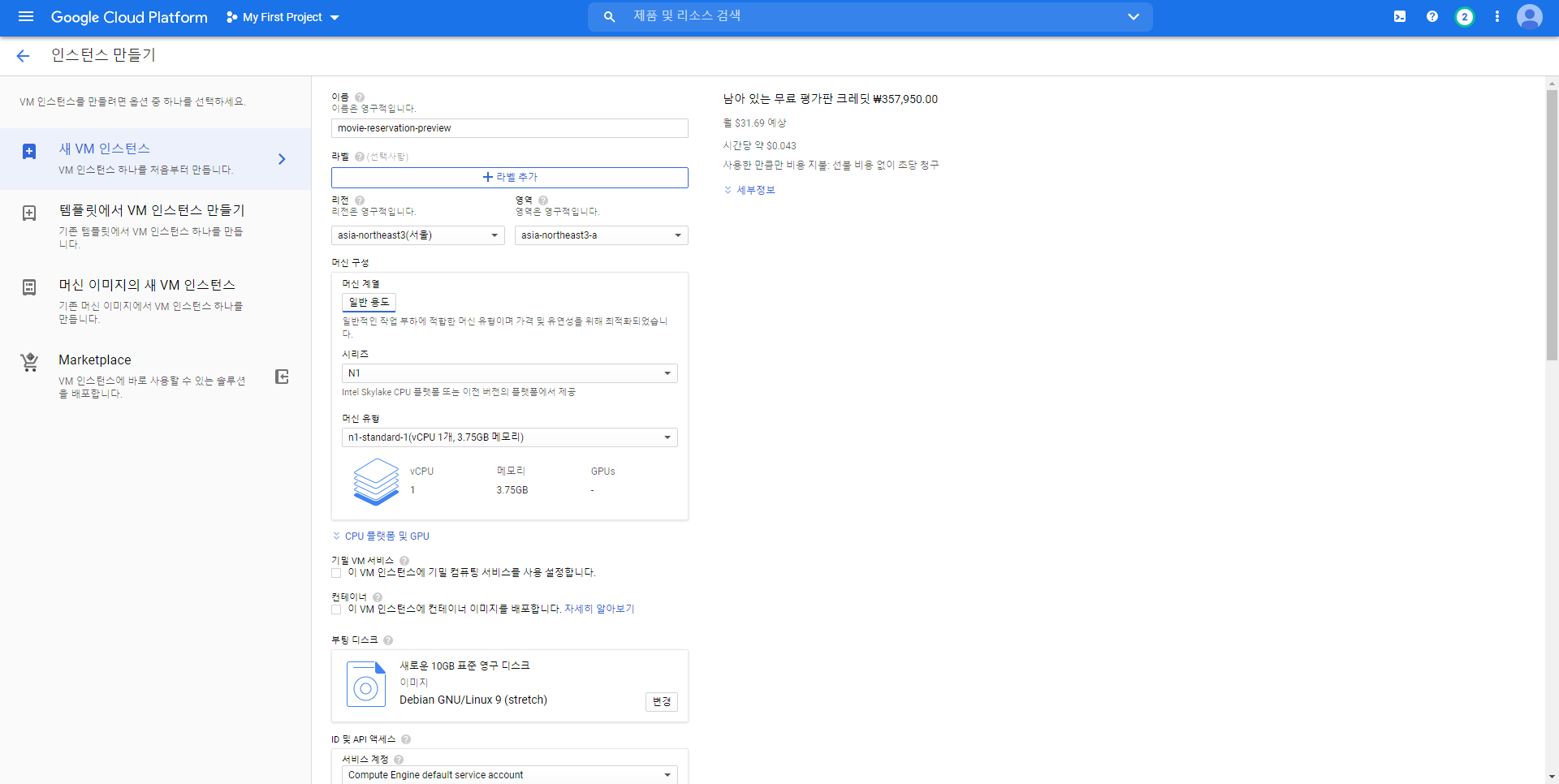 가장 먼저 구글 클라우드 플랫폼에 가입하여 무료 크레딧을 받았습니다.