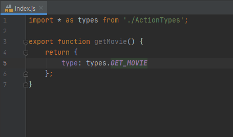 getMovie() 라는 이름으로 액션 생성자를 만들어줍니다. 이 액션 생성자는 객체를 리턴하고, 별다른 매개변수는 필요하지 않으니 빈칸으로 남겨두겠습니다.