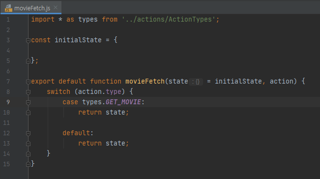 state와 action을 매개 변수로 받는 movieFetch 함수를 선언하고, 우선은 state를 반환하도록 해줍니다. (이 부분은 잠시 후에 다시 다루겠습니다.) 지금은 state만 반환하게 하였지만 우리가 위에서 만들었던 GET_MOVIE 액션을 받게되면 case 문 안 쪽의 코드가 실행된다는 것만 알아두고, 우선은 넘어가겠습니다.
