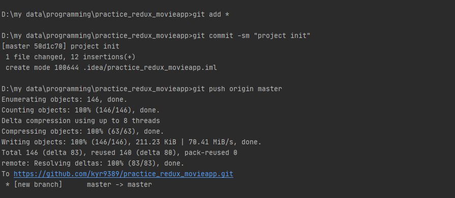 기존에 만들었던 프로젝트를 클론해서 푸시해주겠습니다. 이 커밋이 initial commit이 되겠네요.
