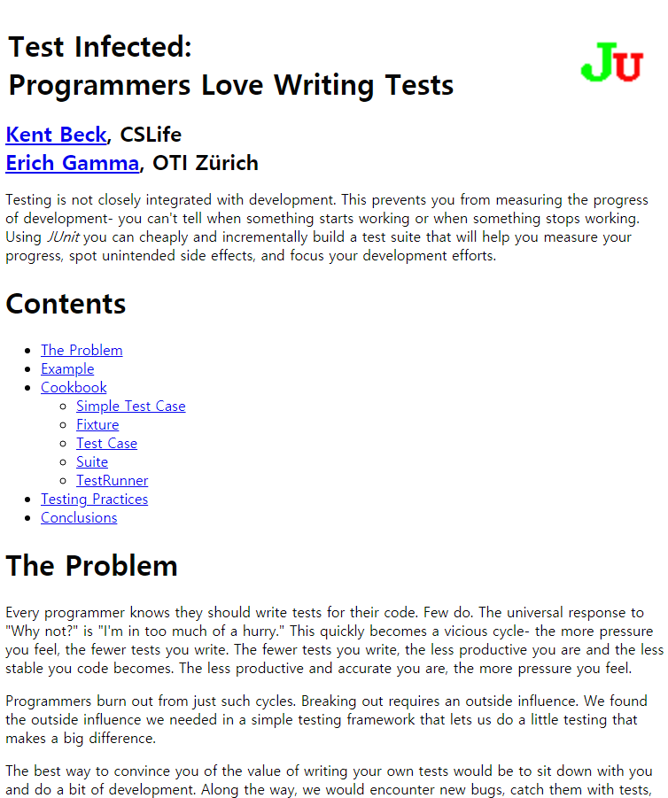 JUnit을 만든 개발자는 켄트 백과 에릭 감마입니다. 두 분 모두 IT 분야에서 유명한 엔지니어이기에 이름 정도는 들어보셨을지도 모르겠습니다. GoF의 디자인 패턴의 저자라고 하면 아실 수도 있을 것 같네요. (바이블이 된 책이죠!) 두 사람은 강연을 위해 애틀랜타로 가는 비행기에 몸을 싣고서, 우연히 만나게 됩니다. 서로가 알고있는 지식에 관심이 많았던 두 사람은 Java를 써본 적 없는 켄트 백에게는 Java를, 에릭 감마에게는 Smalltalk를 알려주기로 하고 작은 프로젝트를 하나 해보기로 했는데 그것이 바로 켄트 백의 단위 테스트 라이브러리인 SUnit의 Java 버젼이었습니다. 비행기 안에서, 세시간에 걸친 페어 프로그래밍으로 만들어진 한 단위 테스트 자바 라이브러리는 후에 JUnit으로 불리게 되었습니다.