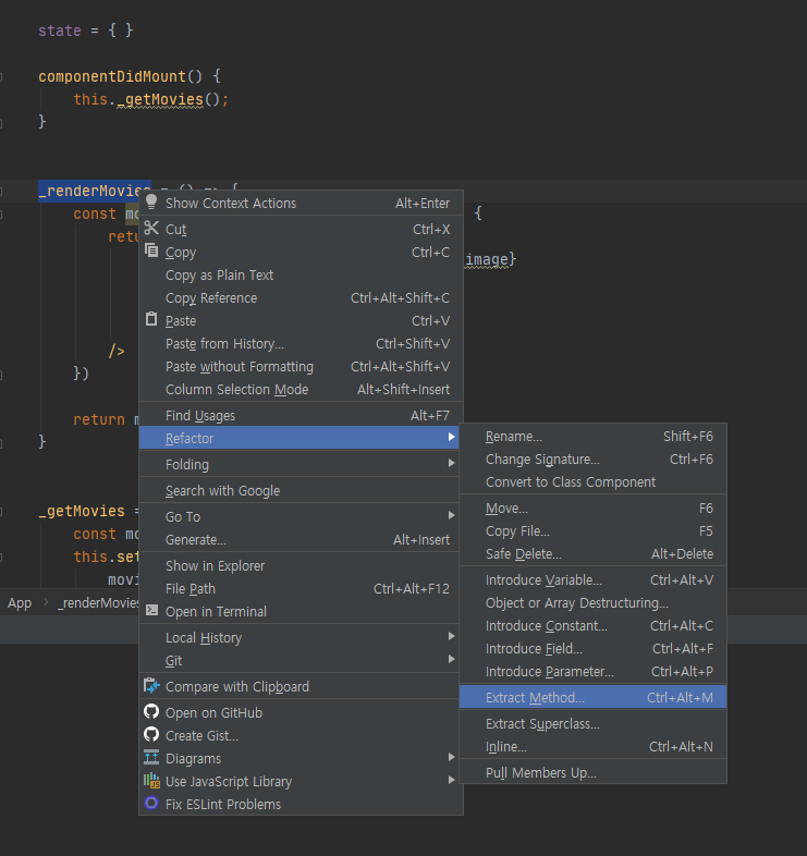 사용하는 방법도 어렵지 않습니다. 인텔리제이 기반의 IDE에서 소스 코드를 드래그하고 마우스 오른쪽 클릭을 하고 Refactor 항목을 눌러주기만 하면 됩니다. 원하는 리팩토링 기능을 바로바로 사용할 수 있게 구현해 놓은 디테일이 돋보이는 개발 환경입니다.