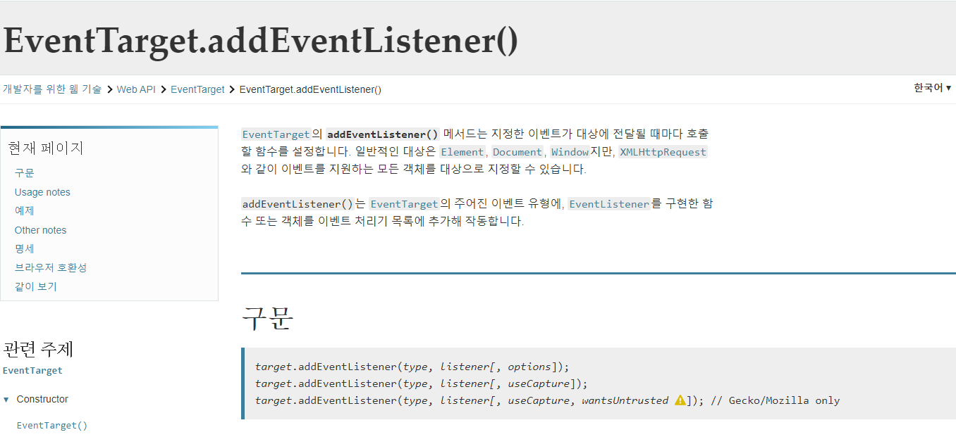 addEventListener의 구문을 보시면 type과 listener 말고도 options와 useCapture, wantsUntrusted 등 다양한 매개변수가 더 있는 것을 알 수 있습니다. 이 중 wantsUntrusted는 리스너를 시스템 그룹에 추가할지 묻는 불리언 타입의 매개 변수인데 실행되는 브라우저 환경이 정해져있는 비표준이기에 주의가 필요합니다.