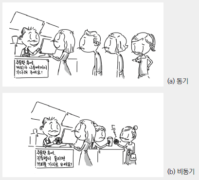 여기 점원이 1명인 카페가 있습니다. 이때 손님 세 명이 와서 주문을 합니다. 만약 점원이 동기적 방식으로 일한다면, 하나의 주문을 받았을때 음료수를 만들기 시작해서, 완성 후 손님에게 전달하기 전까지는 다른 주문을 받을 수 없습니다. 안타깝게도 첫 주문자가 되지 못한 두 명의 손님은 카운터에서 계속 기다려야하는건 덤입니다.