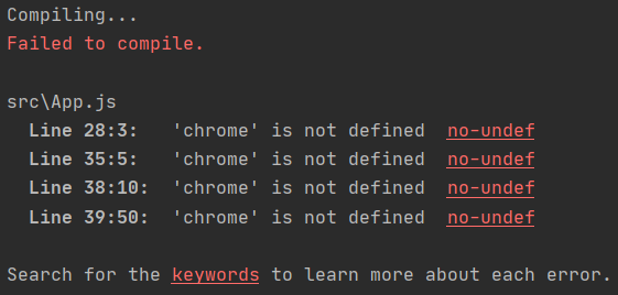 프로젝트 내부에 chrome이 선언되지 않았기 때문에 eslint에서 문제를 삼는 것인데, 크롬 브라우저에서 실행하면 정상적으로 작동하니 걱정말고 무시해주셔도 됩니다. 하지만 이대로 두면 테스트를 할 수가 없기 때문에 린트의 눈을 속일 필요가 있습니다.