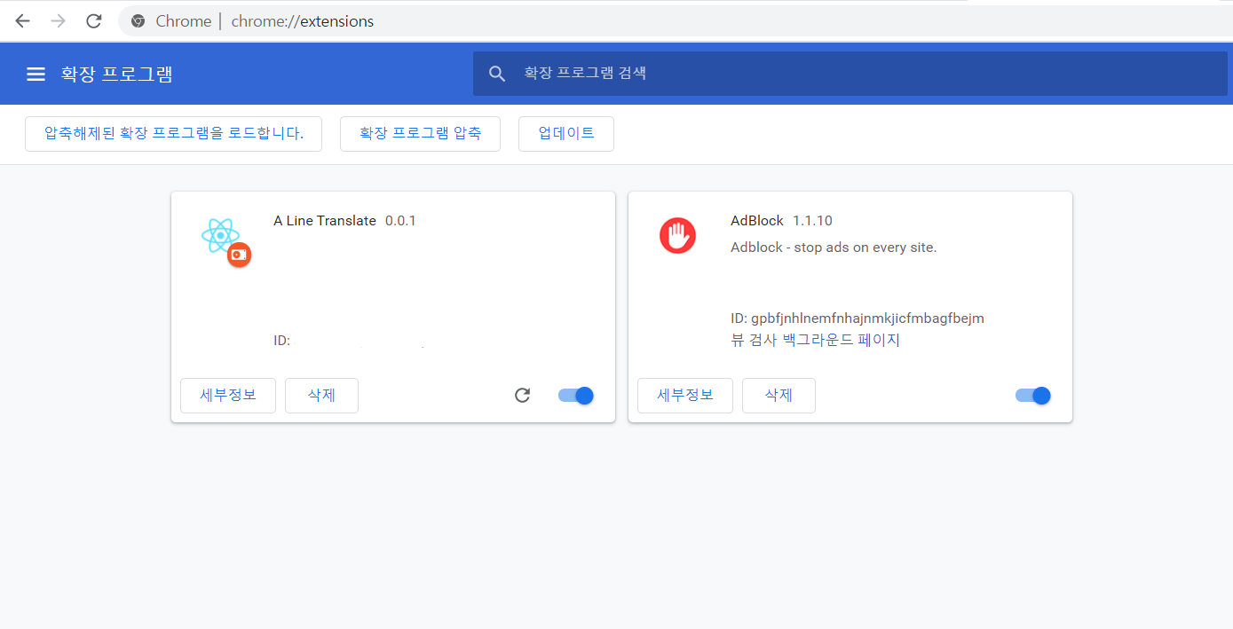 이제 크롬에서 확인해봅시다. 주소창에 chrome://extensions를 입력하거나, 우측 상단 플러그인 탭에 있는 확장 프로그램 관리를 눌러 들어갑니다.