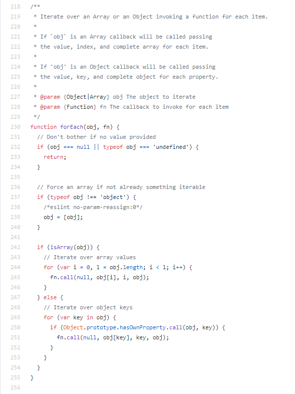 실제로 그 중 가장 긴 함수를 찾아보려고 스크롤을 내려보니 forEach()가 나왔는데, 그 마저도 주석을 제외하면 정확히 21줄이었습니다. 함수 내용도 매우 직관적이고 간단합니다. 배열 뿐 아니라 순서 있는 오브젝트같은 이터레이터들까지 순회할 수 있도록 제작된 함수입니다.