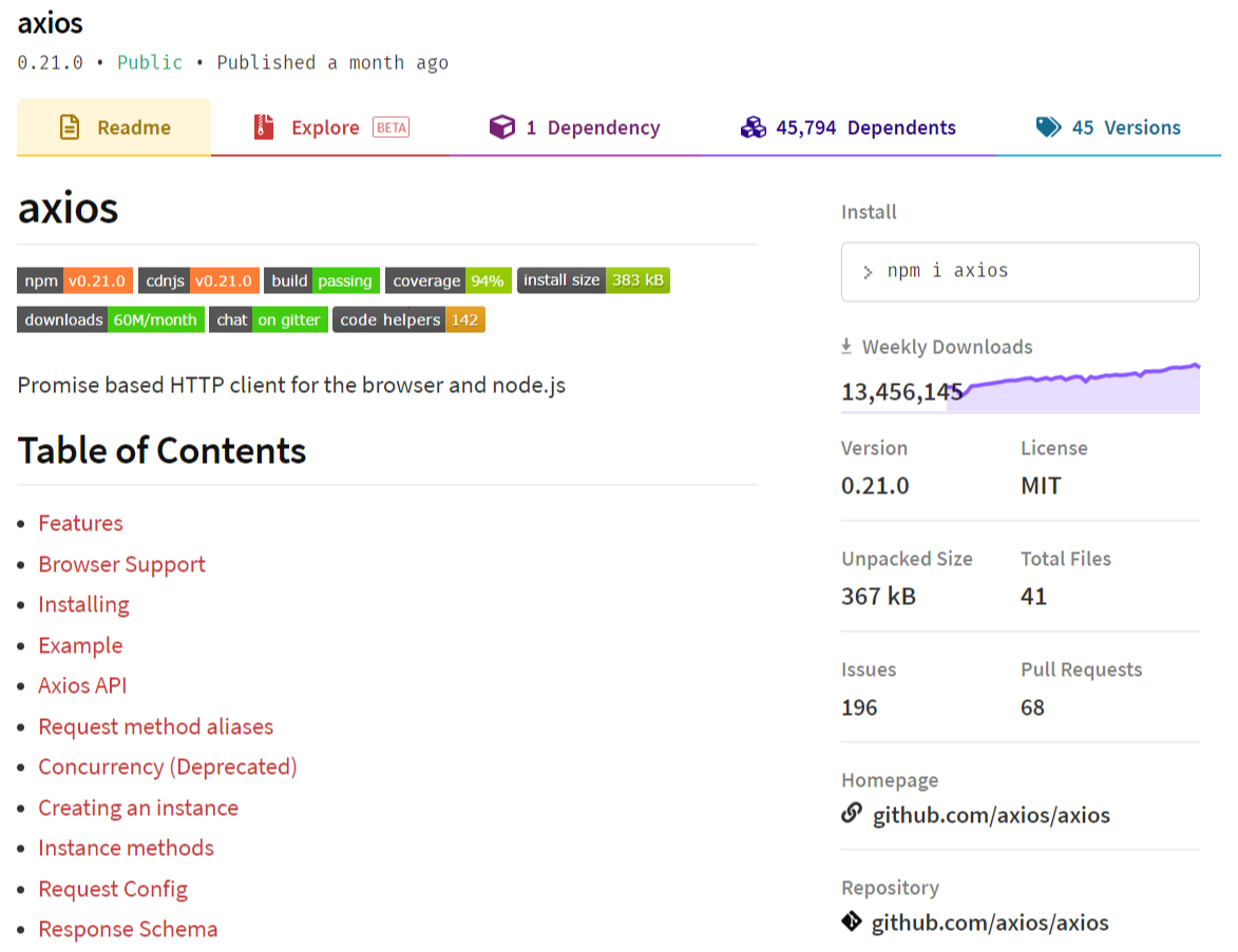 가벼운, Promise 기반의, XHR 라이브러리를 지향점으로 2014년에 시작된 이 프로젝트는 2020년 현재 1000개에 가까운 커밋 로그를 남기고 250명이 넘는 컨트리뷰터가 함께할만큼 수 많은 사람들이 사용하고 기여한 대중적인 라이브러리가 되었습니다. 저도 네트워크 통신 기능을 구현하며 몇 번 사용해 본 기억이 있네요.