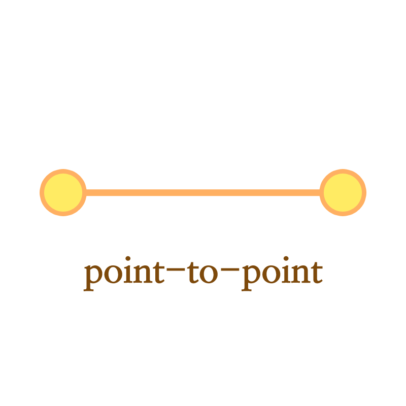점대점 구조는 가장 단순한 형태의 망 구성 방식으로, 두 장치 사이의 전용 링크를 갖고 있는 1:1 연결 구조입니다. 장치 간의 실제 길이 만큼의 전선이나 케이블을 사용해서 유선으로 연결하거나, 전파나 위성 링크를 통해 무선으로 연결합니다. 선형 토폴로지(Linear Topology)라고도 부릅니다.