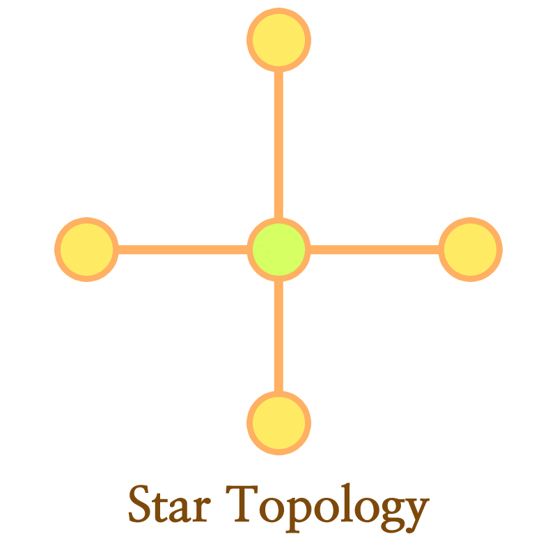 각 장치에 허브(hub)라고 하는 중앙 컨트롤러에 대한 전용 점대점 링크가 있는 중앙집중식 망 구조입니다. 중앙에 연결된 허브가 데이터 경로를 개설하고 유도하는 역할을 합니다.