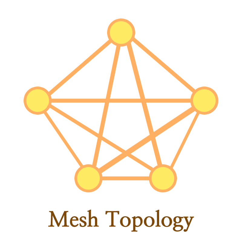 모든 장치들끼리 점대점으로 연결되어 있는 형태입니다. 따라서 노드(장치)의 갯수가 n이라고 했을때, 필요한 링크의 갯수는 n(n-1)개입니다. 쌍방향(duplex) 통신의 경우엔 n(n-1)/2 개의 링크가 필요합니다.