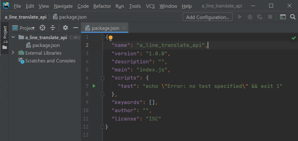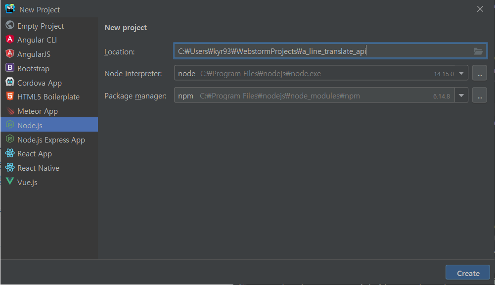 Node.js 기반의 프로젝트를 새로 생성합니다. 이름은 a_line_translate_api 정도가 좋을 것 같습니다.