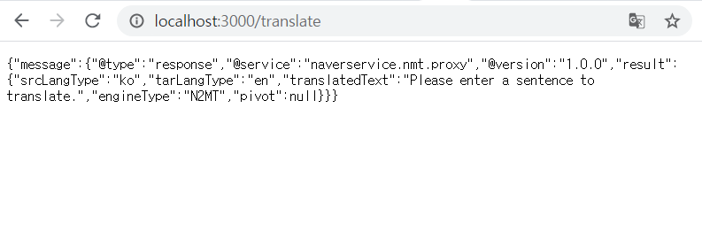 샘플 텍스트였던 "번역할 문장을 입력하세요" 가 Please enter a sectence to translate로 번역되어 나온 모습입니다. 의도했던대로 잘 나오네요. 이제 샘플 텍스트 부분은 지우고, 우리가 원하는 텍스트를 보내도록 option을 살짝 바꿔줍니다.