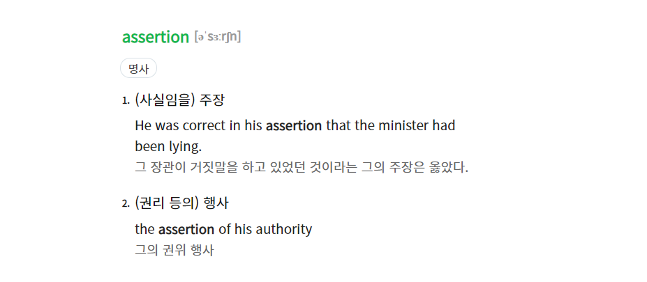 어서션(assertion)은 단어 그대로 (~~가 사실임을) 주장하다, 단언하다 등의 의미를 갖고 있습니다. 어떠한 대상을 명확히 하겠다는 의도로 사용하는 단어입니다.