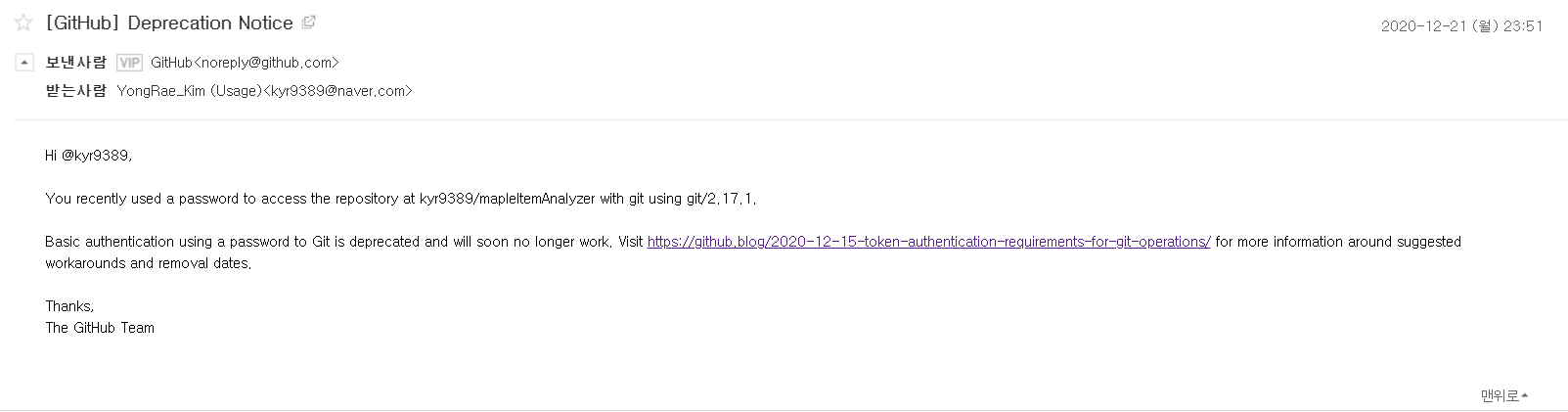 얼마 전 평소처럼 코딩을 하고 깃허브에 푸시를 했는데, 갑작스레 deprecation 메시지가 뜨면서 한 통의 메일이 왔습니다.