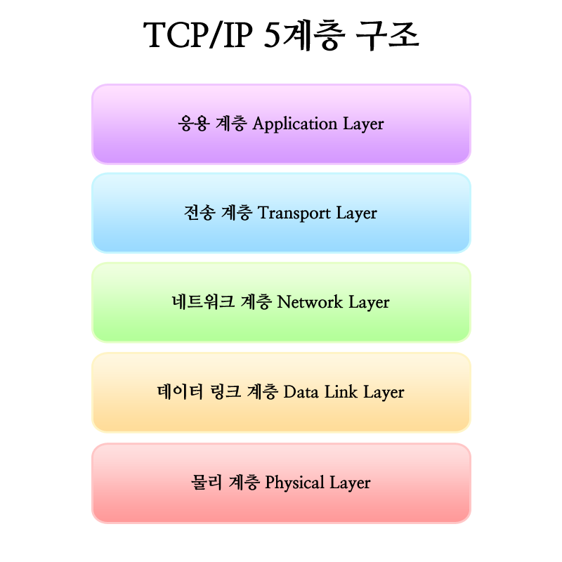책에 따라 4계층 또는 5계층으로 설명하기도 하는데, 4계층의 경우 아래에 설명할 물리 계층과 데이터 링크 계층을 하나로 묶어 네트워크 인터페이스로 취급합니다. 둘 사이에 크게 차이는 없으니 이 글에서는 5계층으로 설명하도록 하겠습니다.