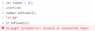 이런 현상이 발생하는 이유는 프로퍼티로 접근하기 위해 사용한 마침표 (.) 가 앞의 숫자 리터럴에 합쳐져 27.0 으로 해석되었기 때문입니다. 소수 형태의 값에 메소드를 적용하려 했지만 접근을 위한 마침표가 존재하지 않기 때문에 toFixed() 메소드를 찾지 못한 것입니다.