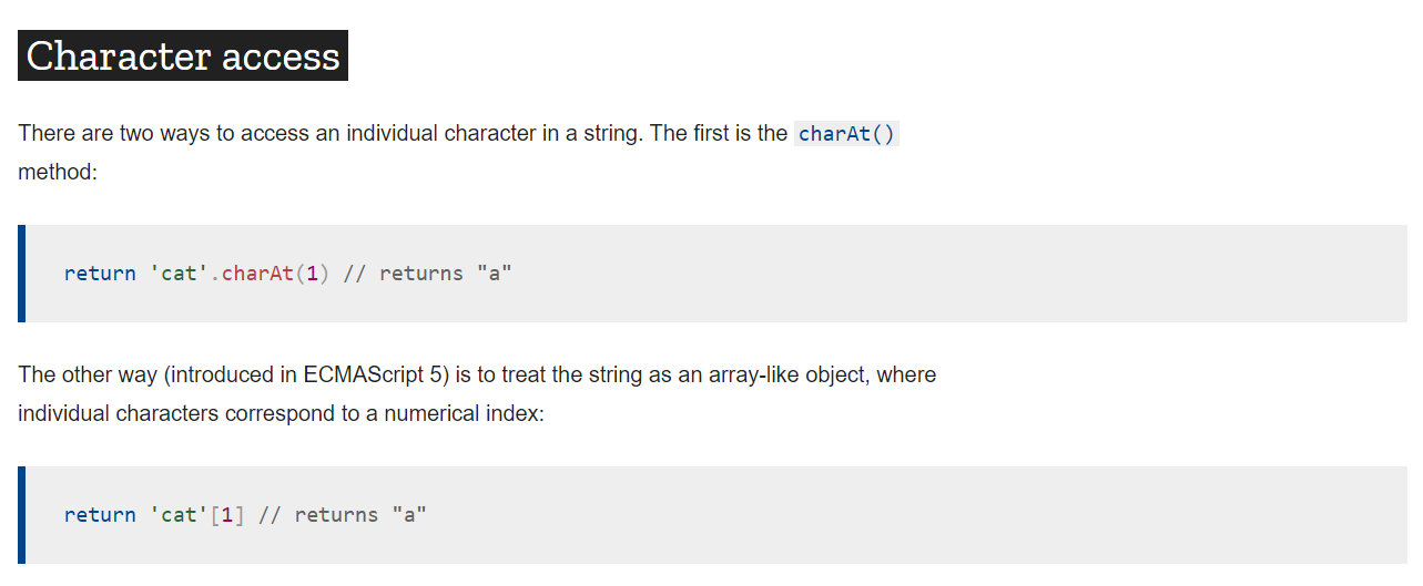 그러나 자바스크립트에서의 문자열은 단순히 문자의 배열이 아닙니다. 배열이라면 당연히 지원해야할 인덱스를 통해 요소에 접근하는 방법도 모든 브라우저에서 지원하지는 않습니다. (ES5부터 추가된 기능입니다. IE10 이전 버젼에서는 불가능합니다.)